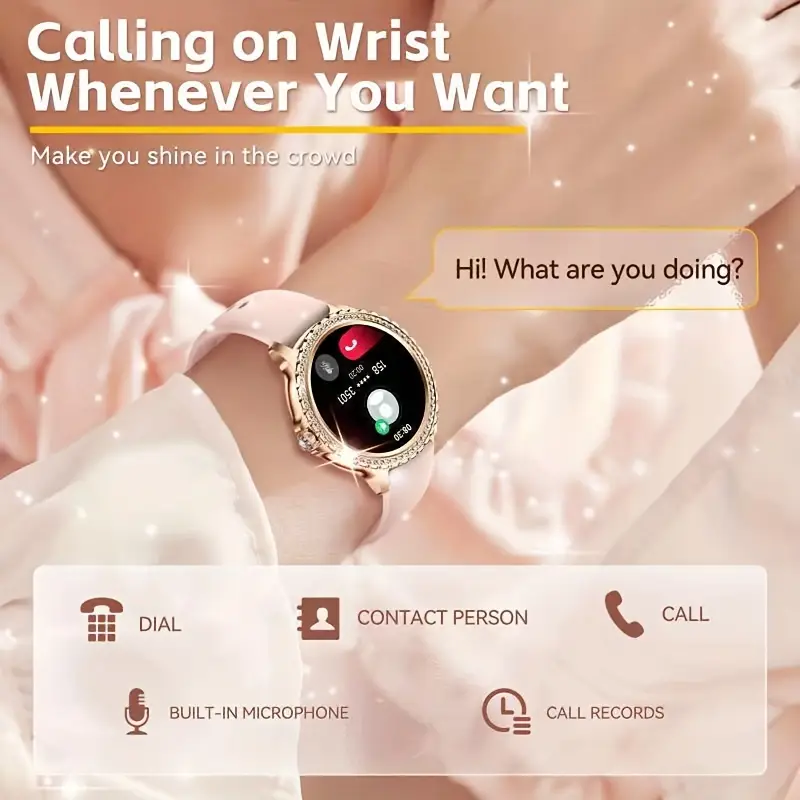 JELLOO - 3.35cm HD pełny ekran dotykowy, połączenia bezprzewodowe, wodoodporność IP68, akumulator litowo-jonowy, akcenty złotych i perłowych, idealny do iPhone'a i Androida, stylowy akcesorium.